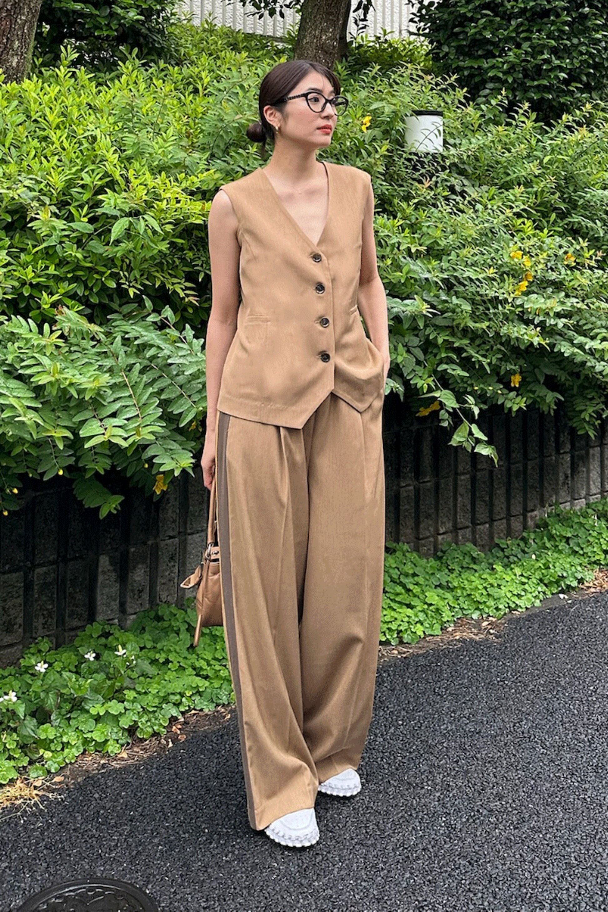 同素材のベストと合わせて、旬のセットアップスタイルが即完成。
