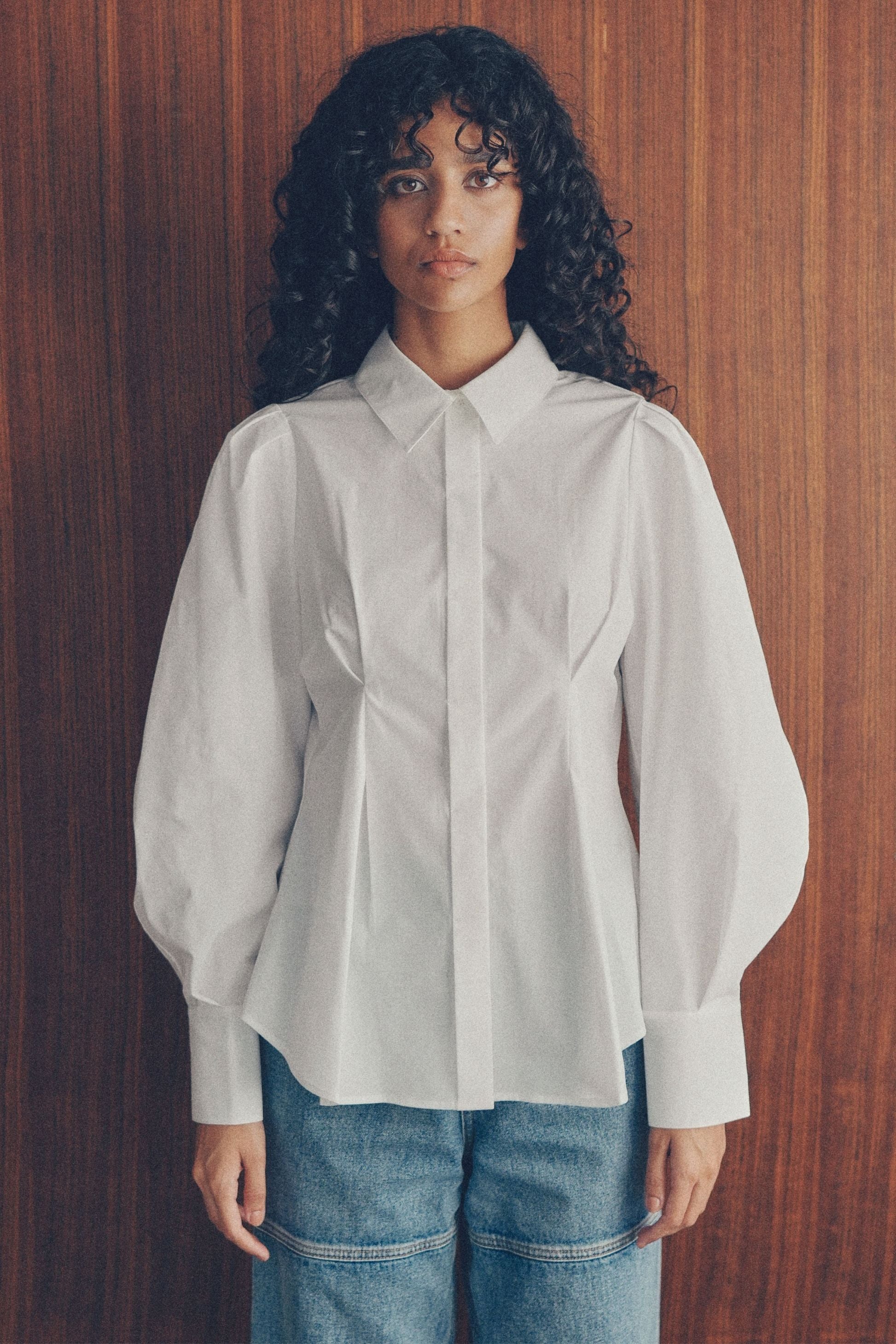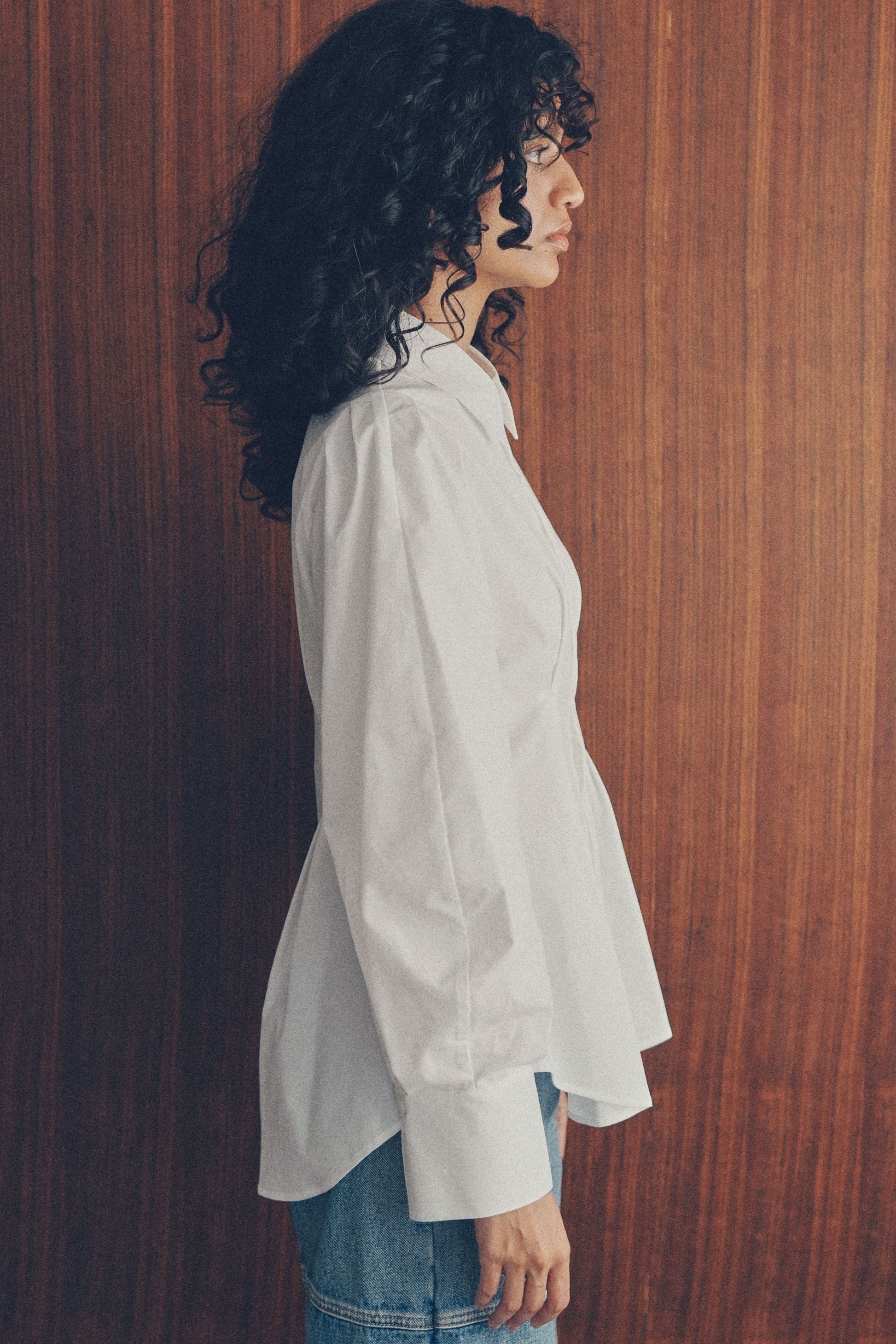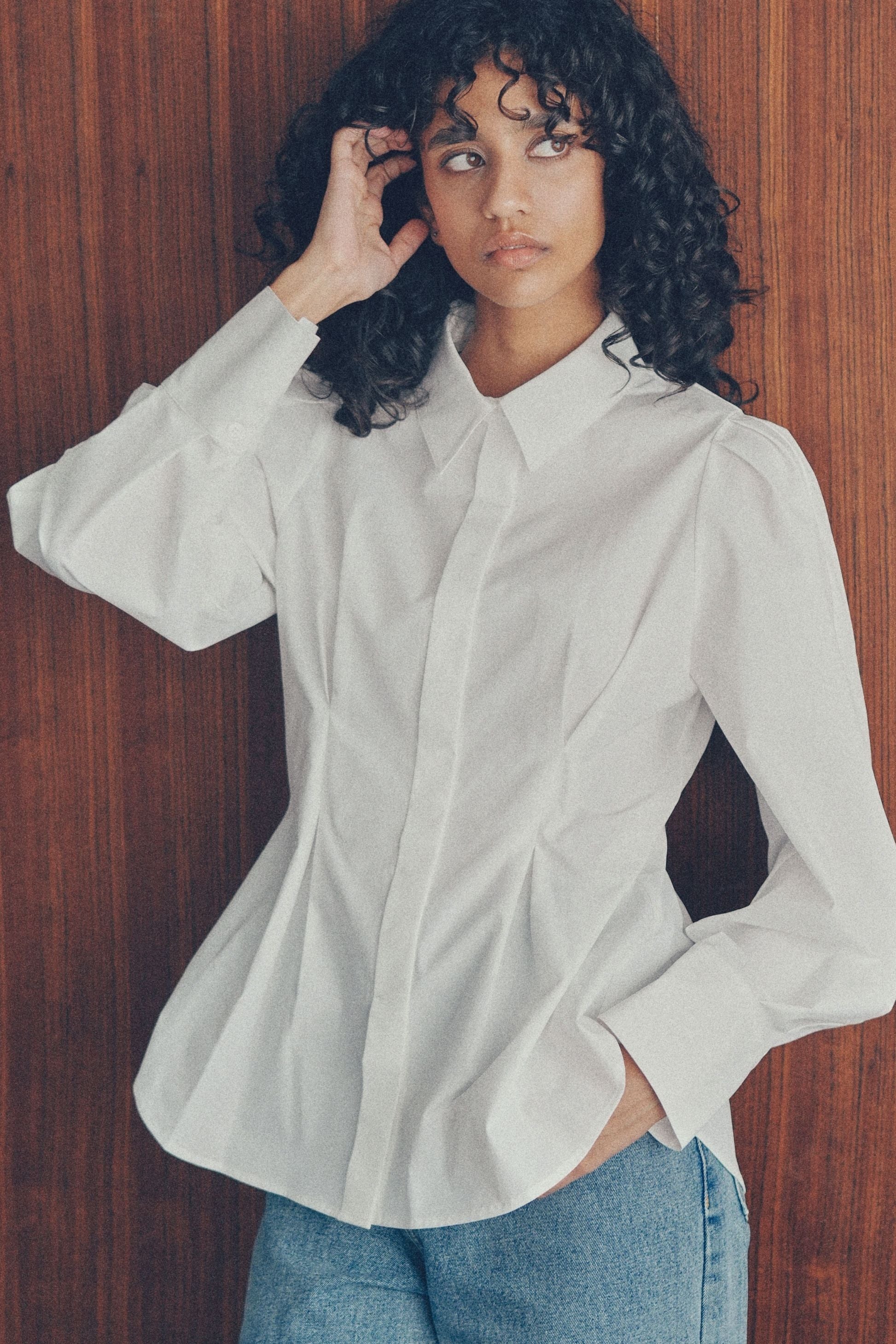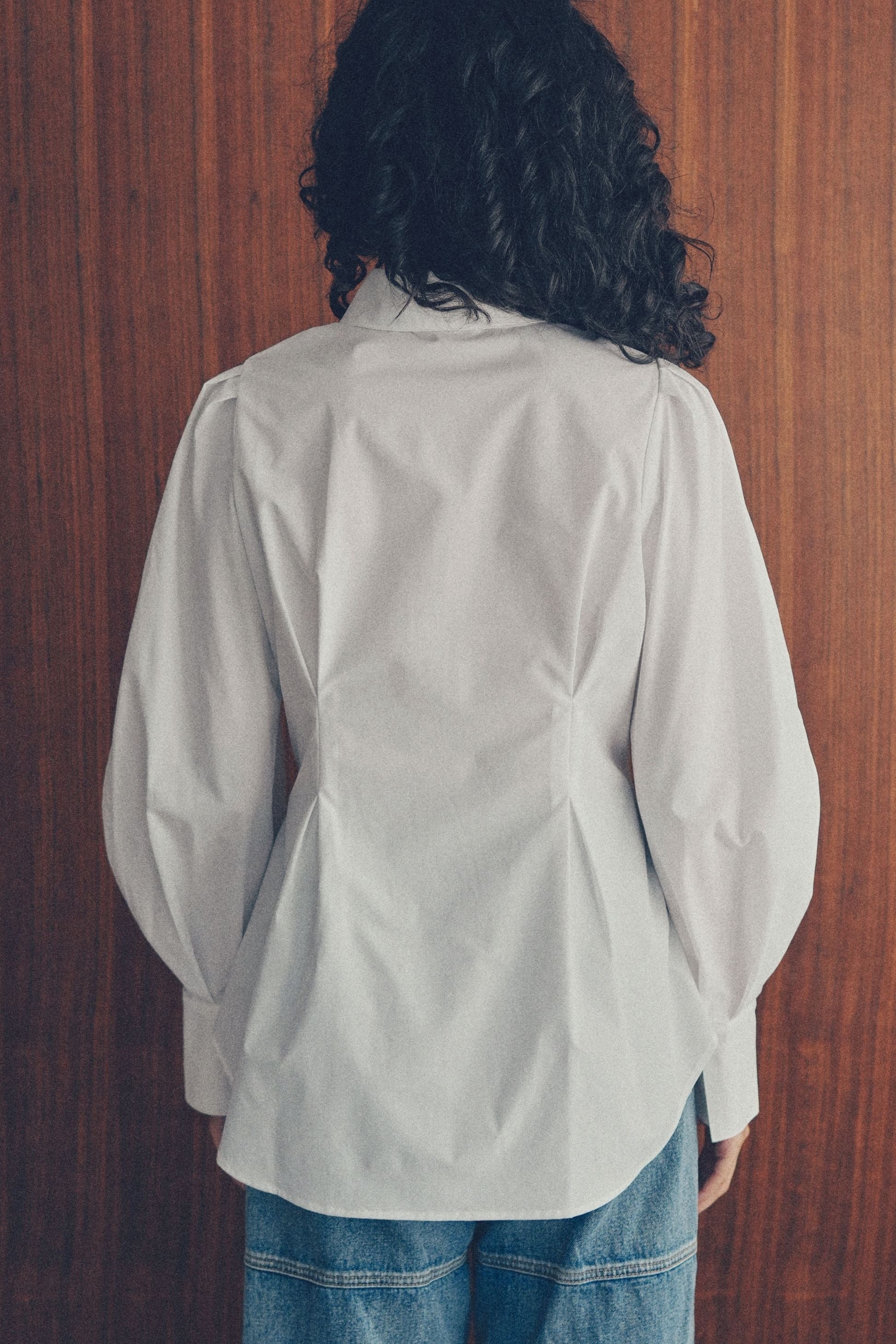ウエストに施されたタックが、立体感と美しいシルエットを生み出すシャツ。