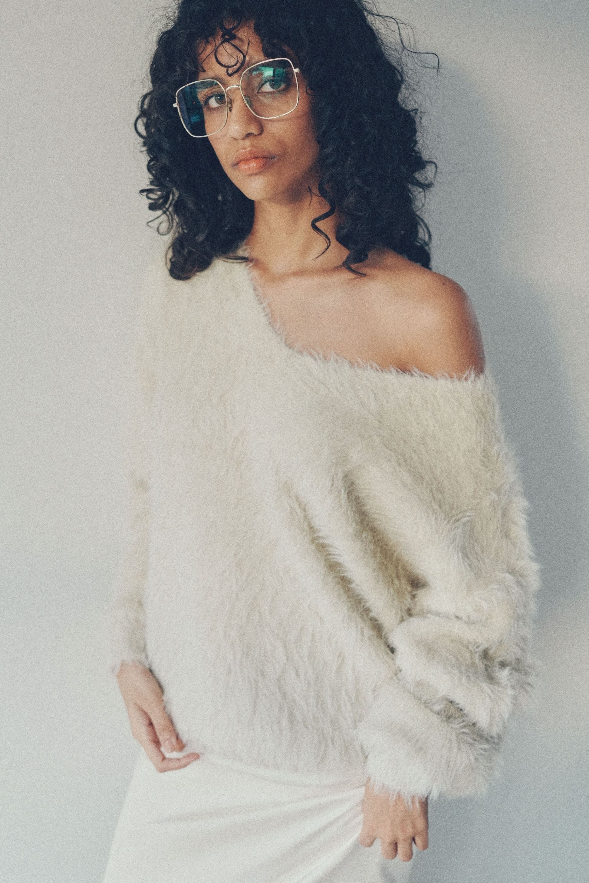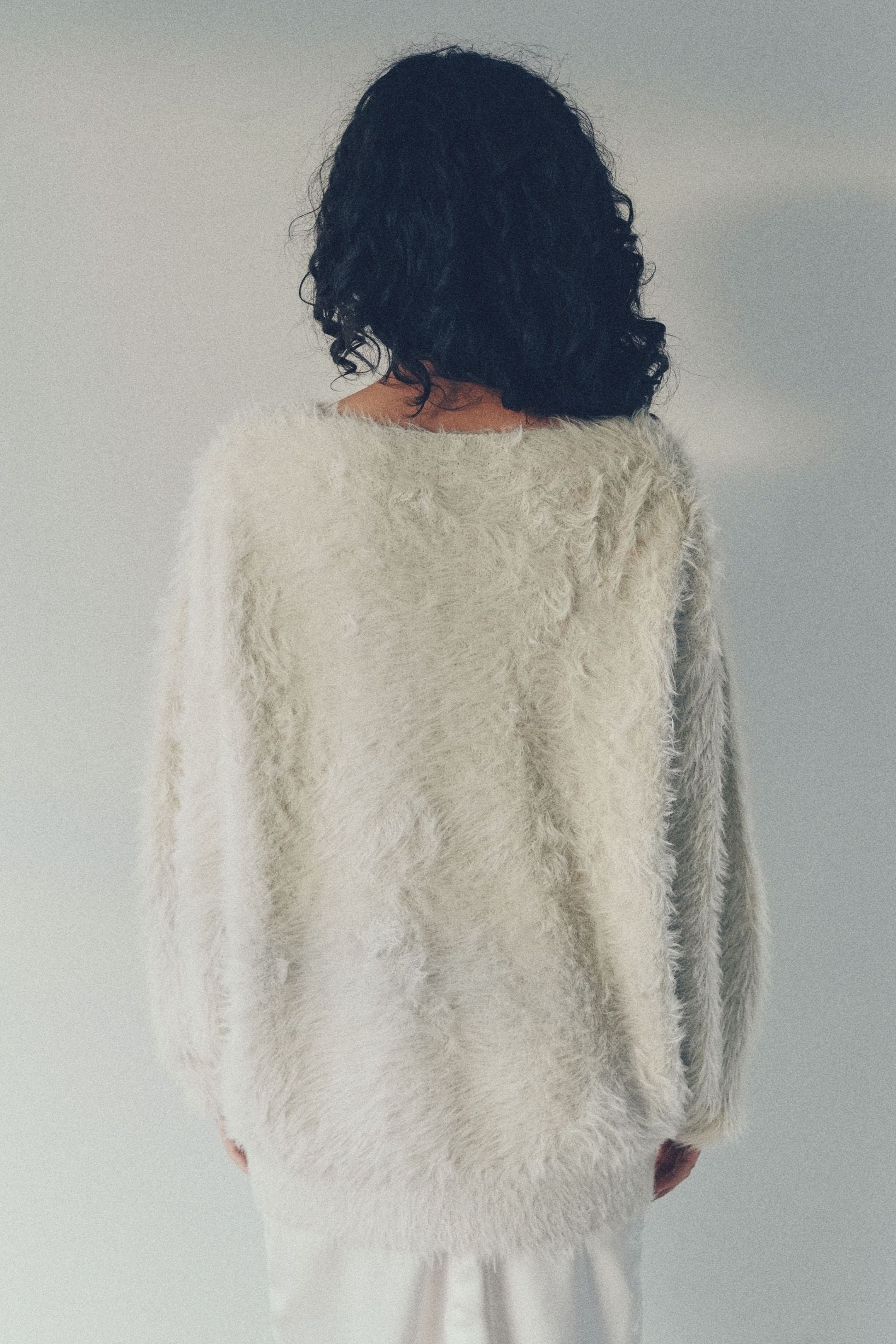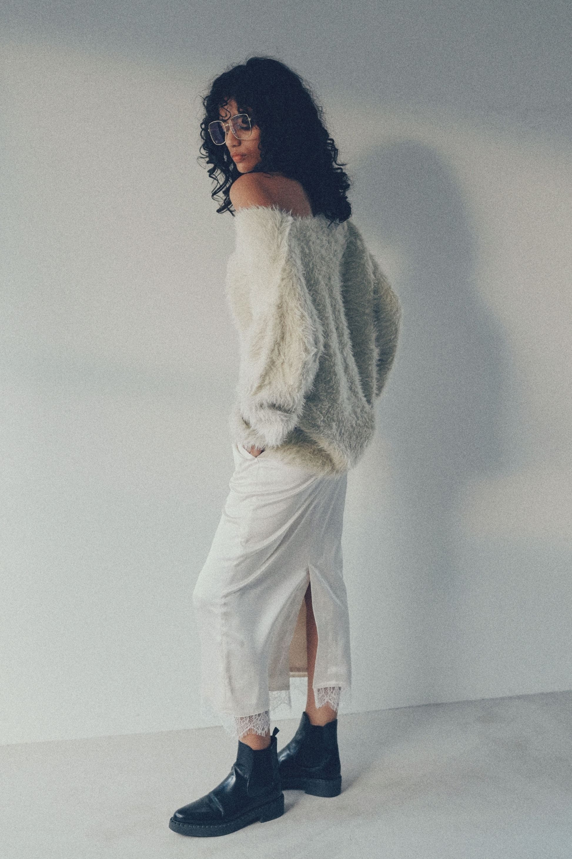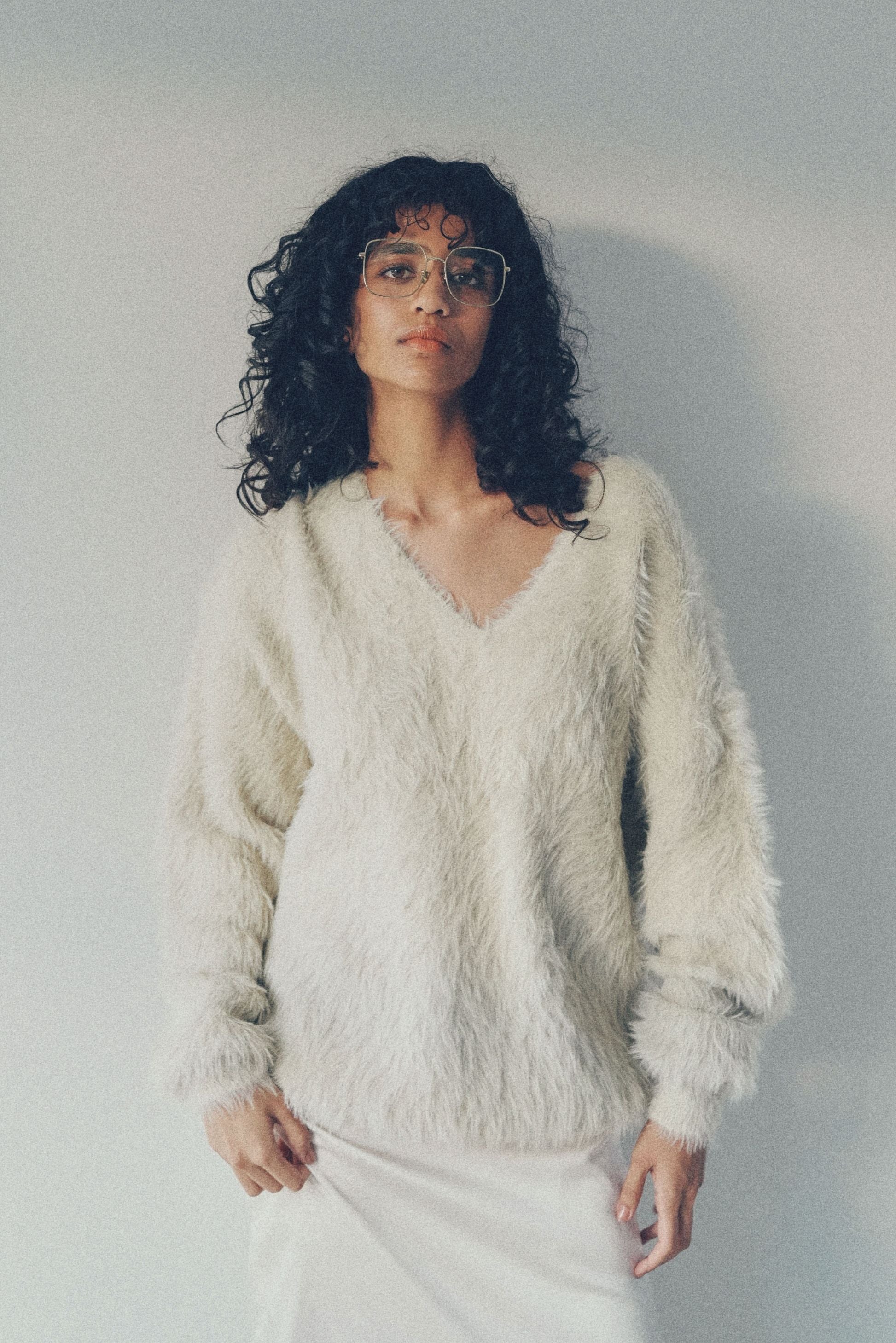 柔らかなフェザーヤーンとVネックの抜け感で魅せる、上品リラックスニット