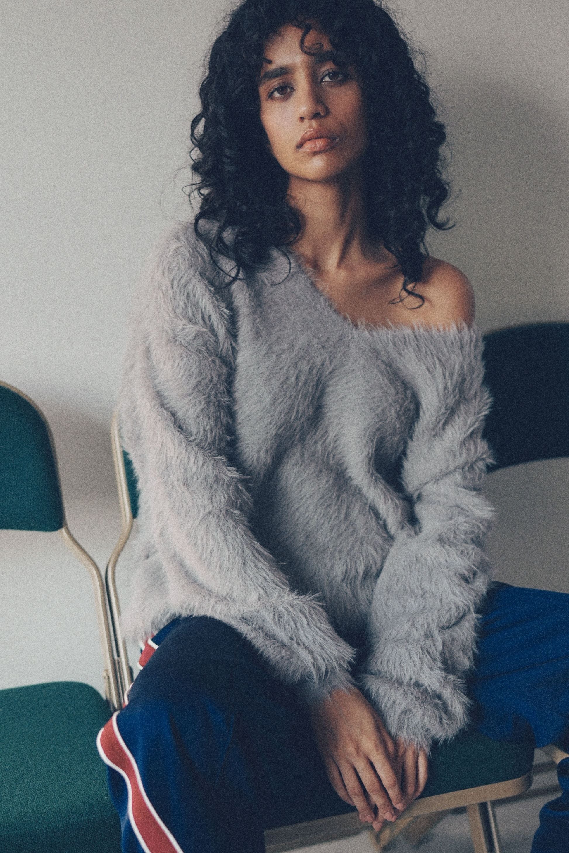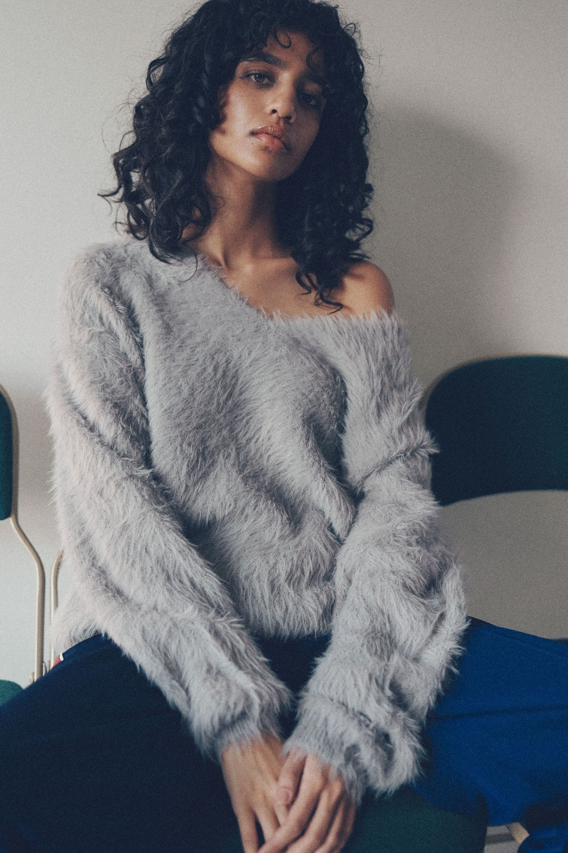 柔らかなフェザーヤーンとVネックの抜け感で魅せる、上品リラックスニット