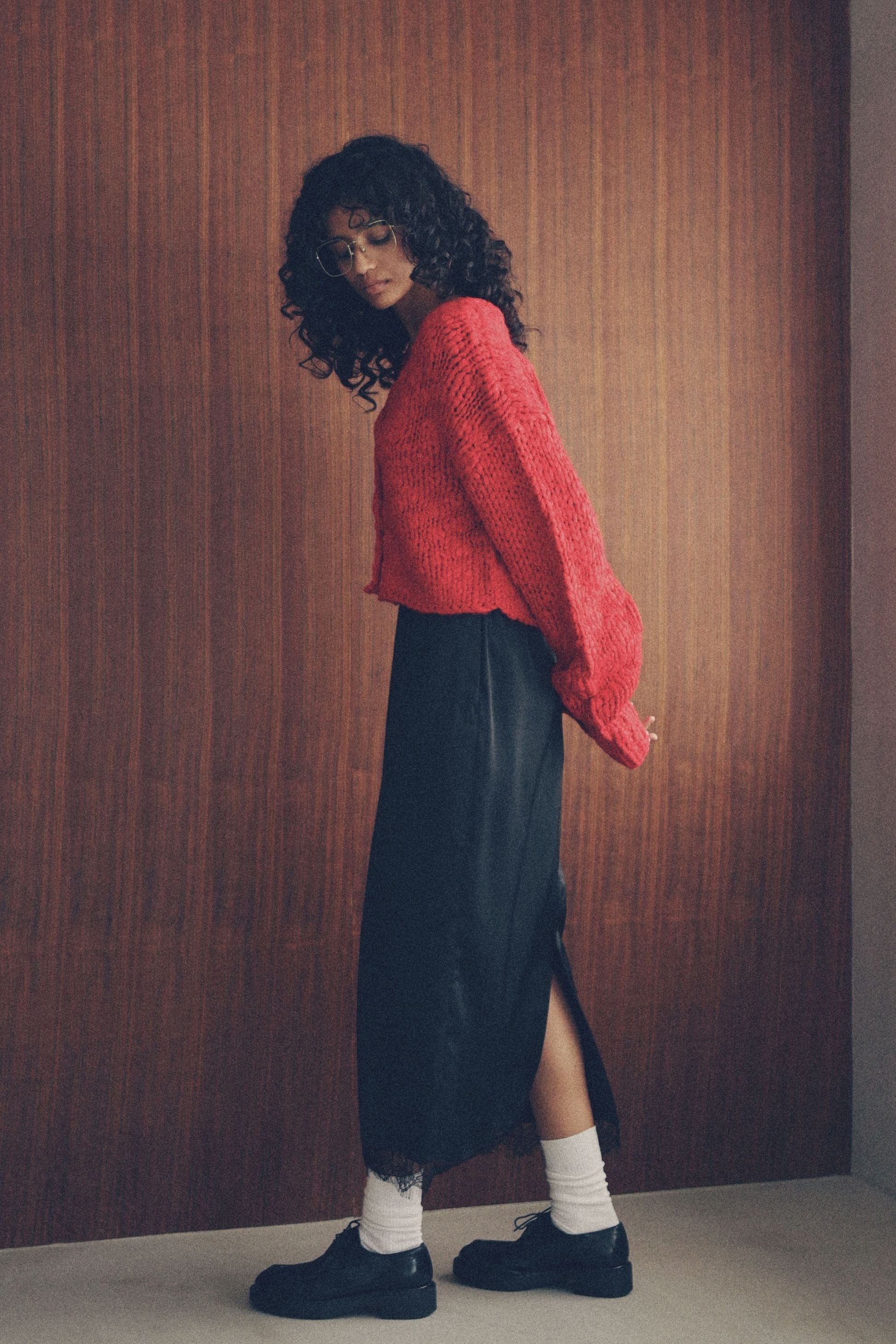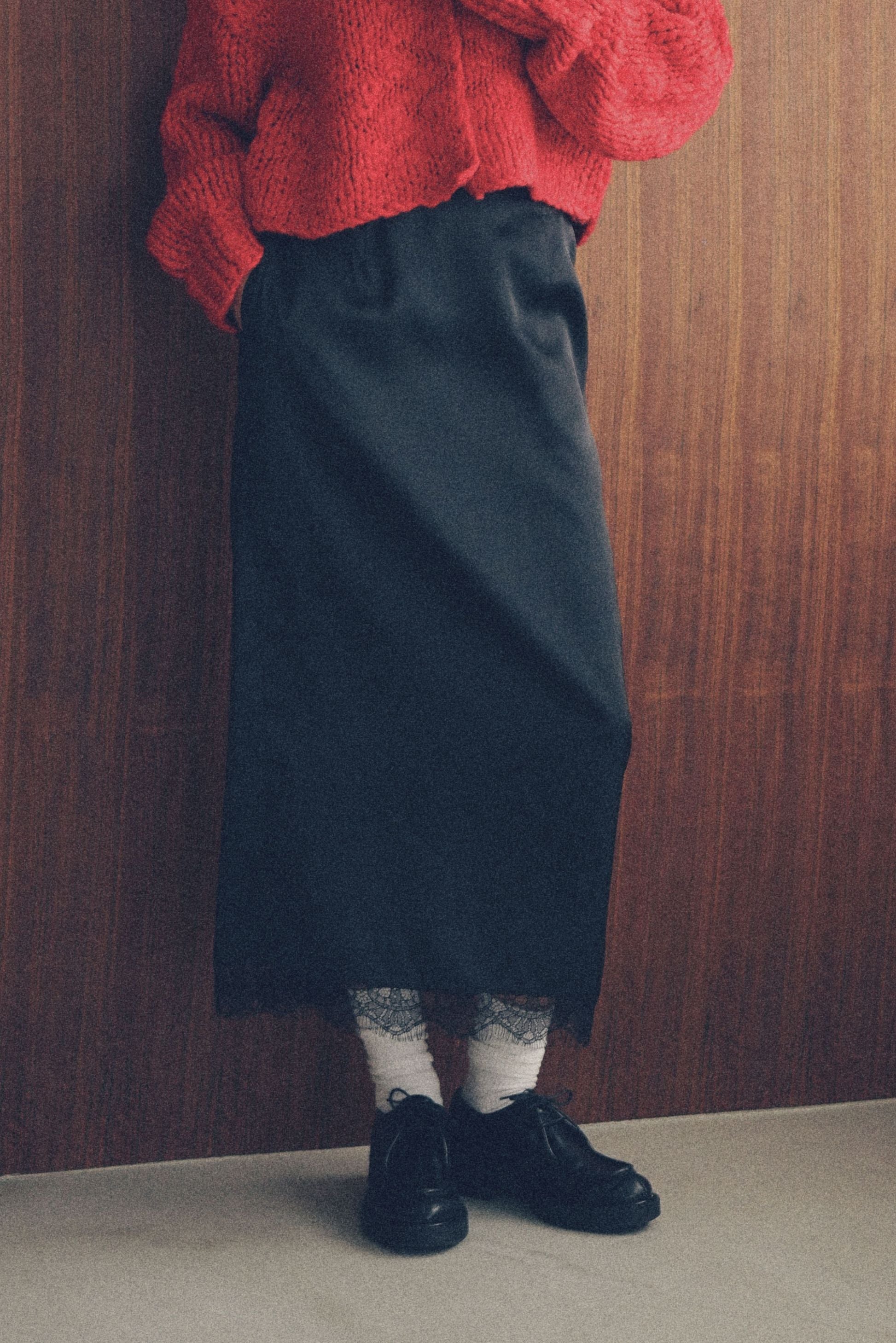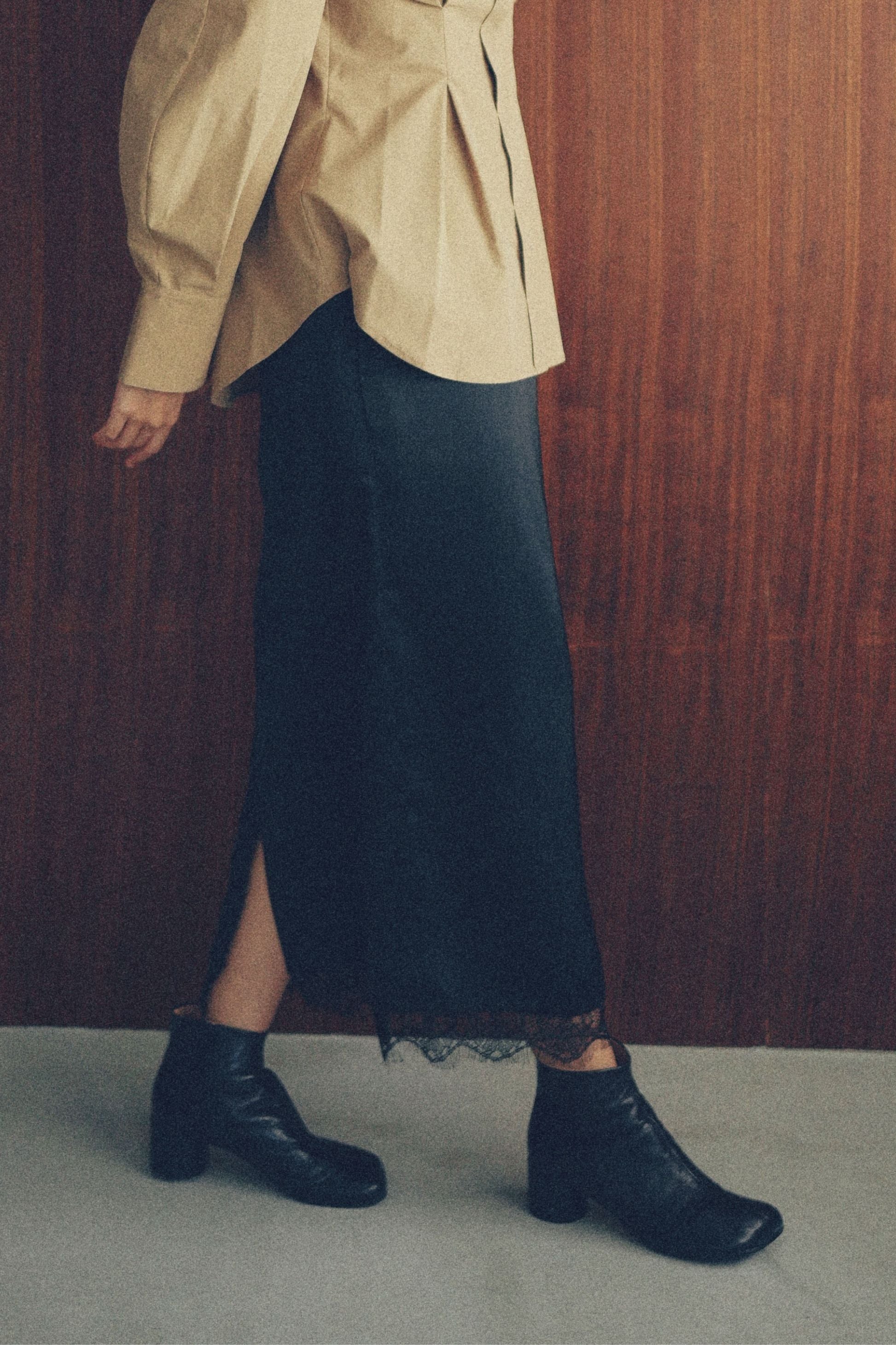 光沢サテン×繊細レースで、1枚で絵になる主役スカート。