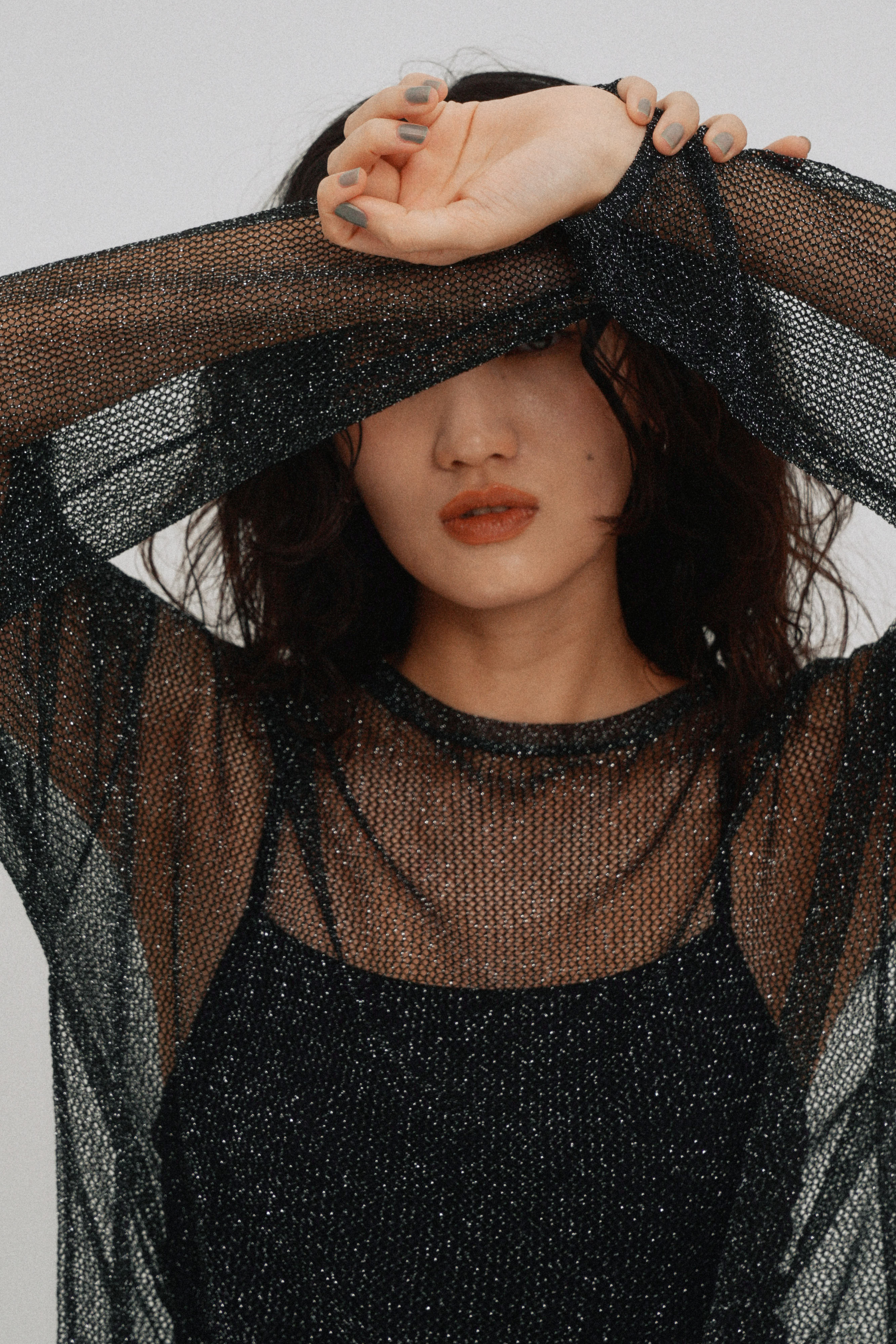 また、ラメ入り生地でさりげなく華やかさをプラスし、シンプルな中にもエッジィな雰囲気を醸し出します。