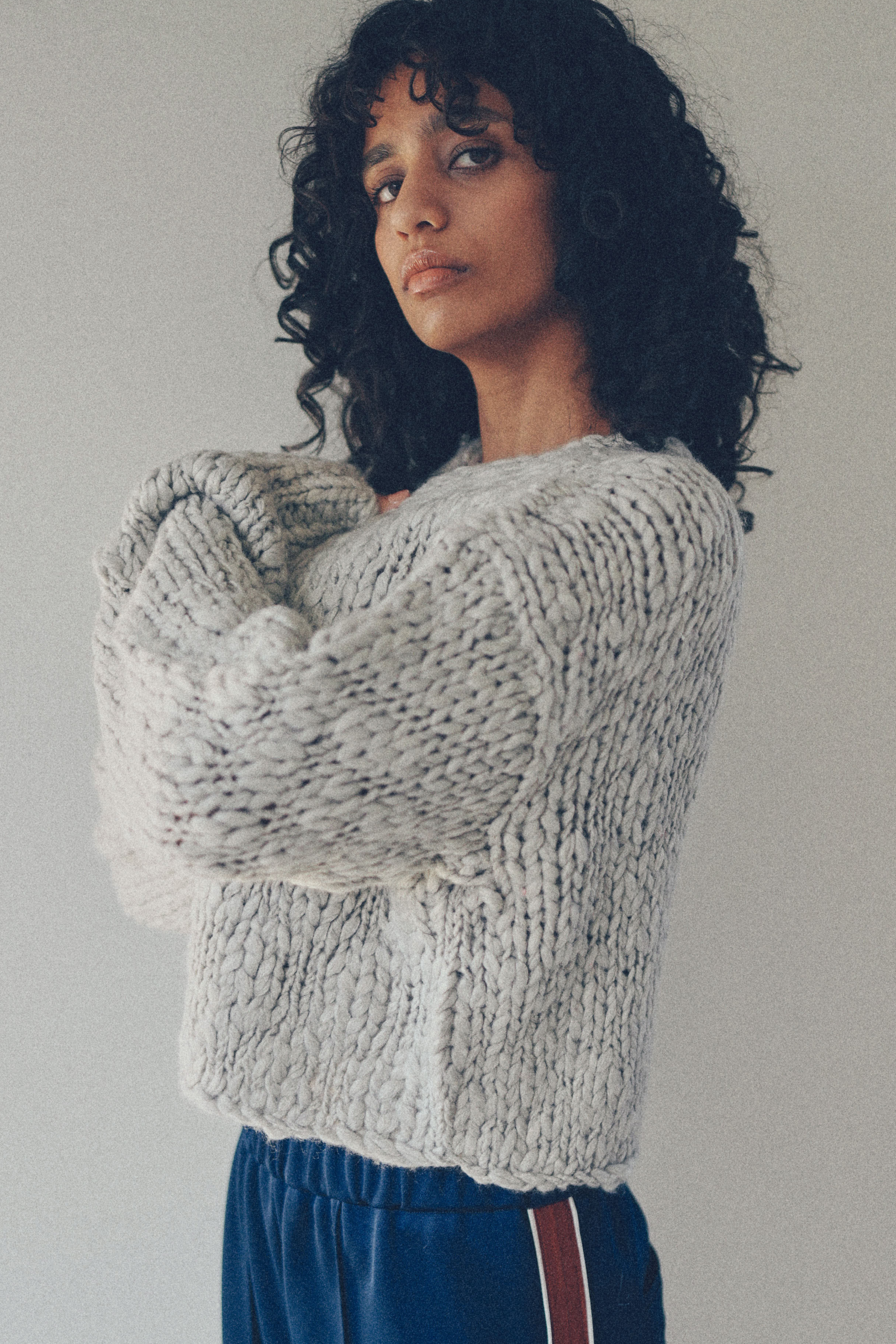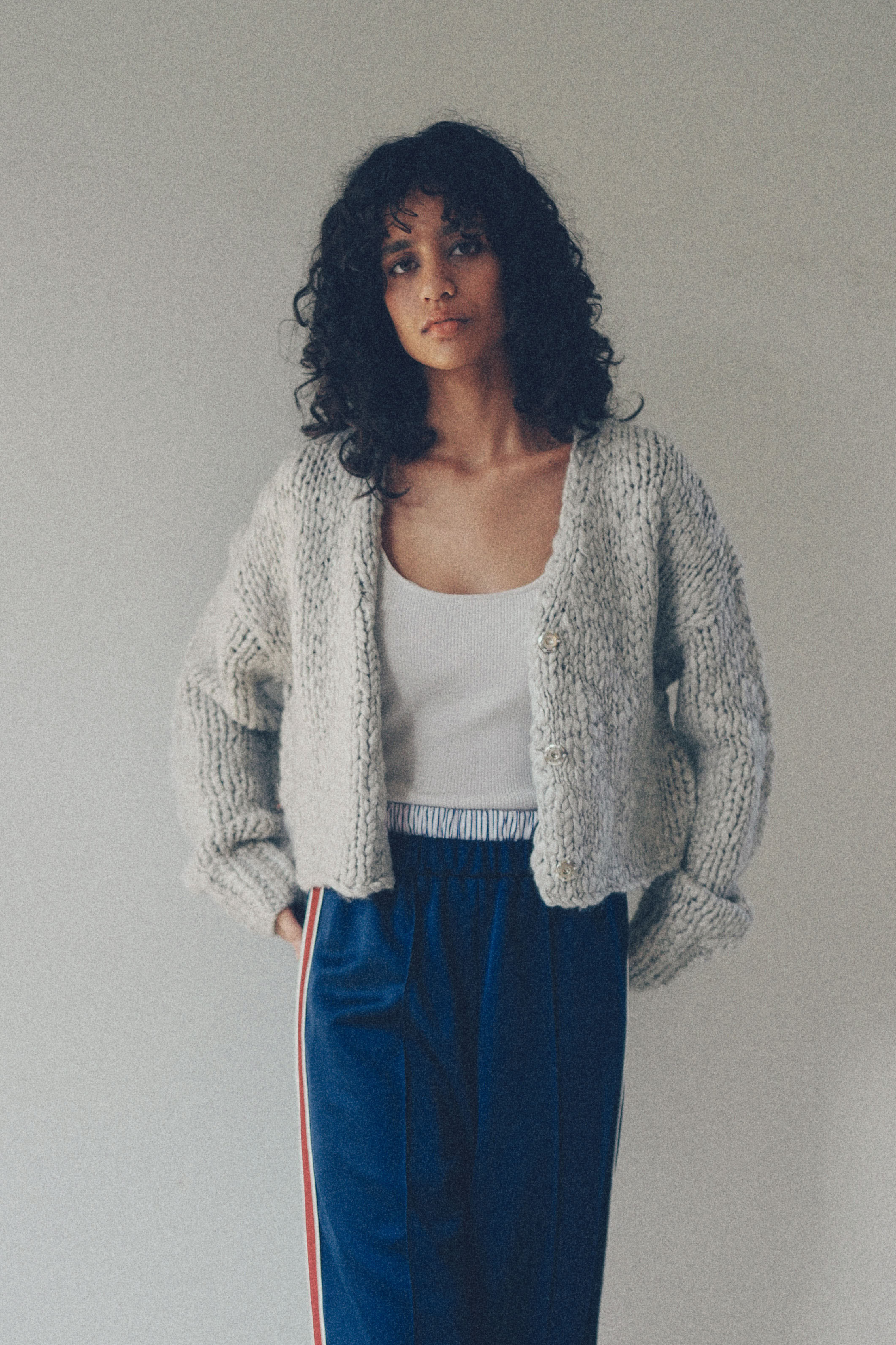 モヘアタッチの軽やかさとVネックの抜け感で、こなれ感たっぷりの主役ニット。