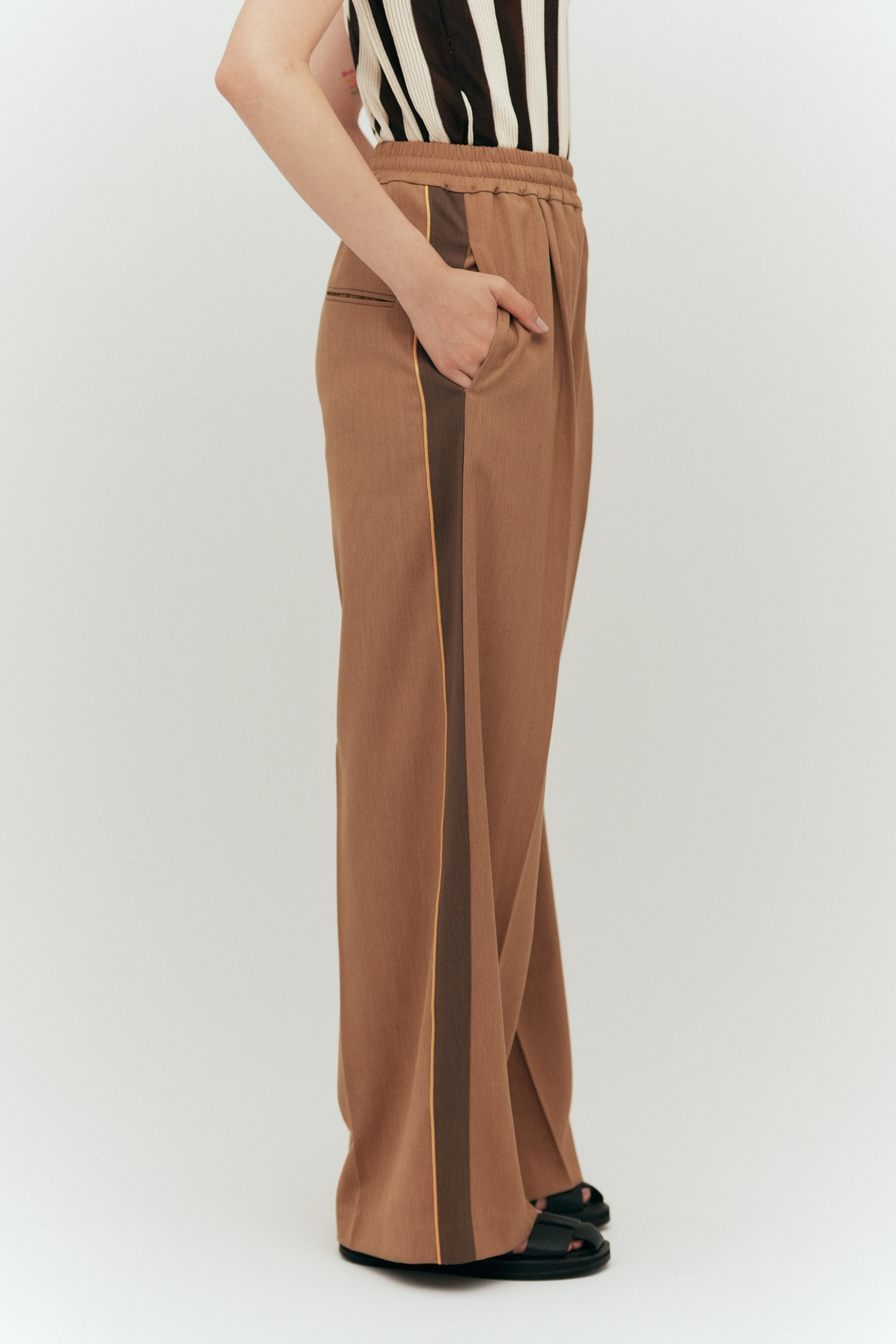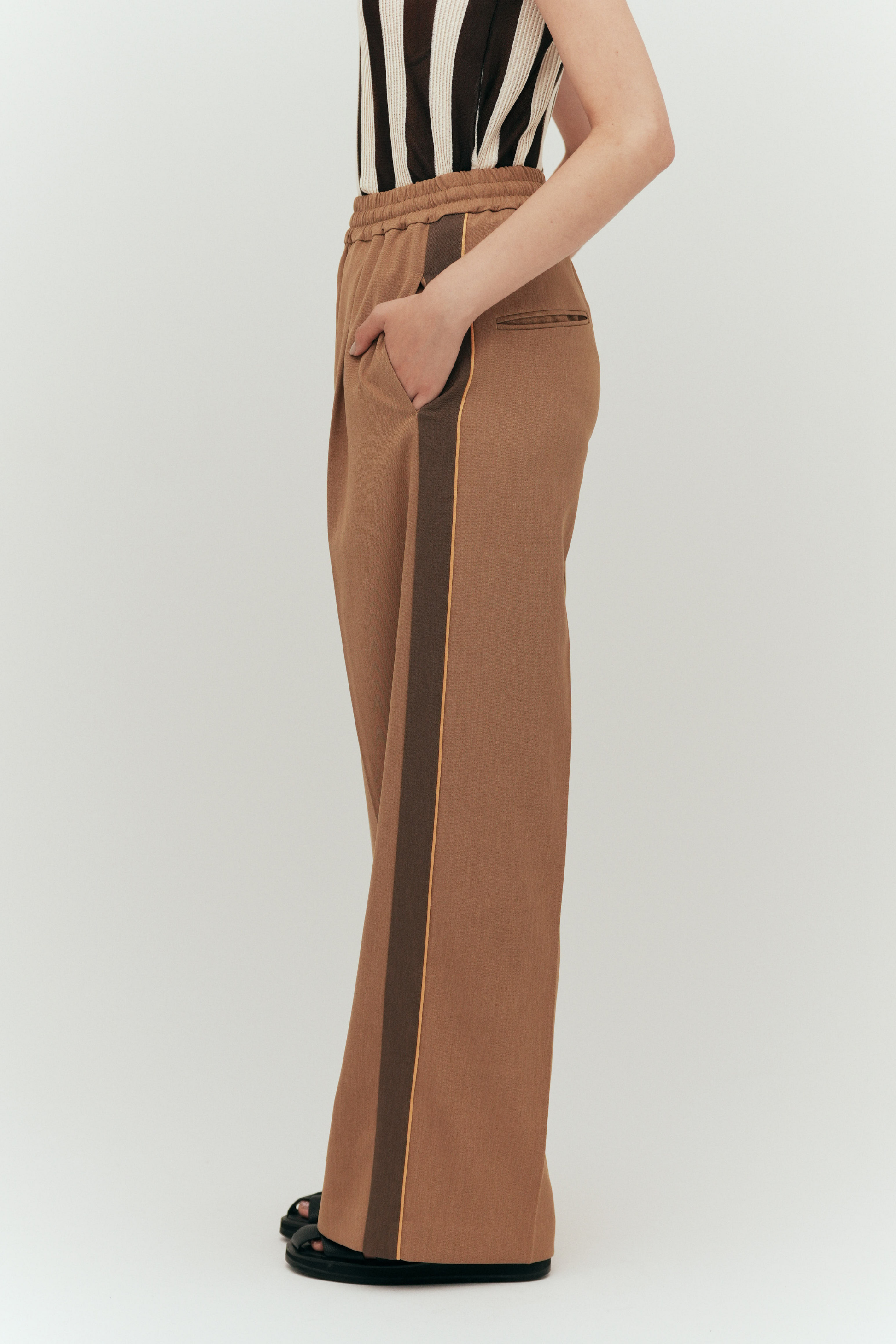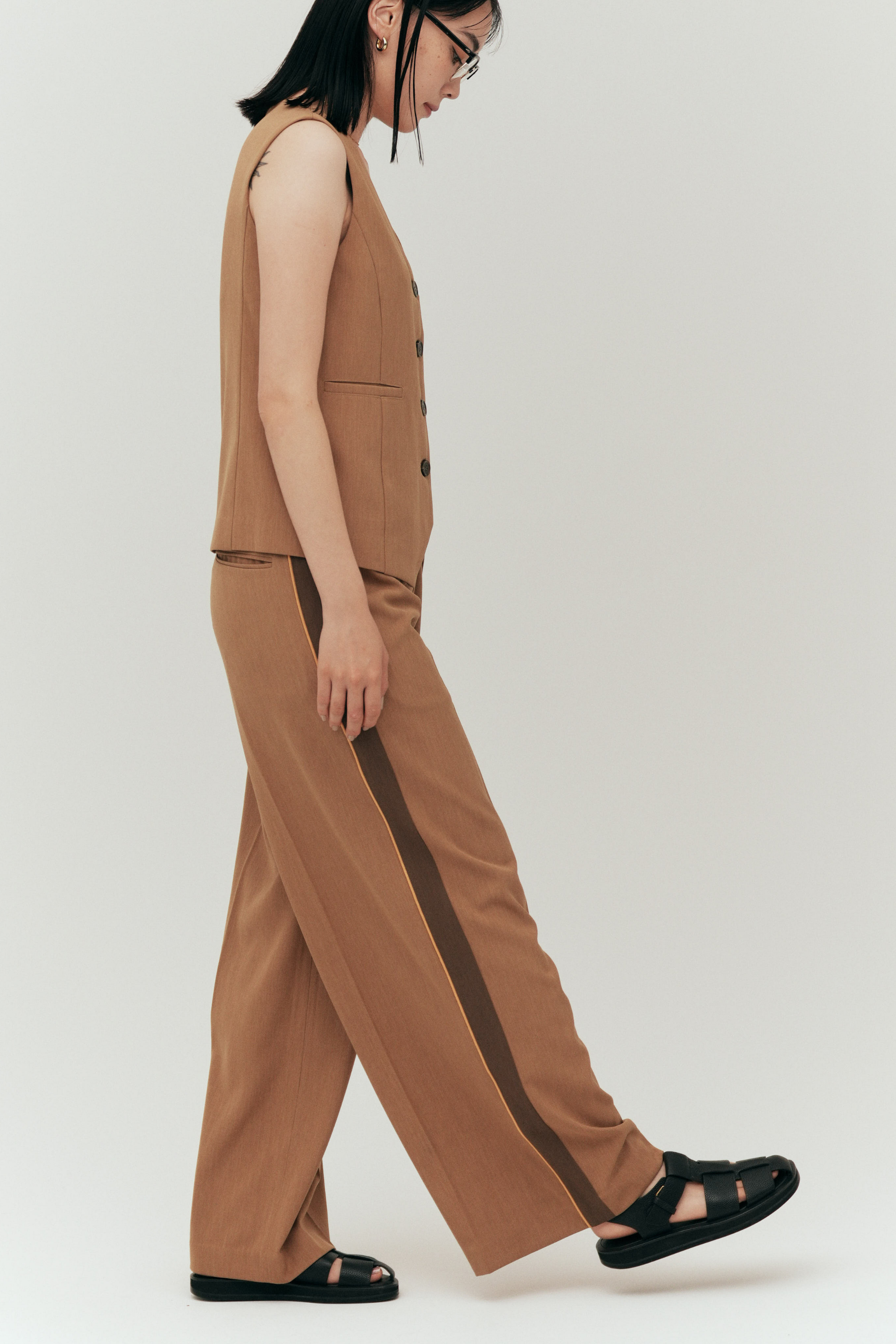脚長効果バツグンのサイドライン、縦のラインが視覚的にすっきり見せ、スタイルアップを叶える。