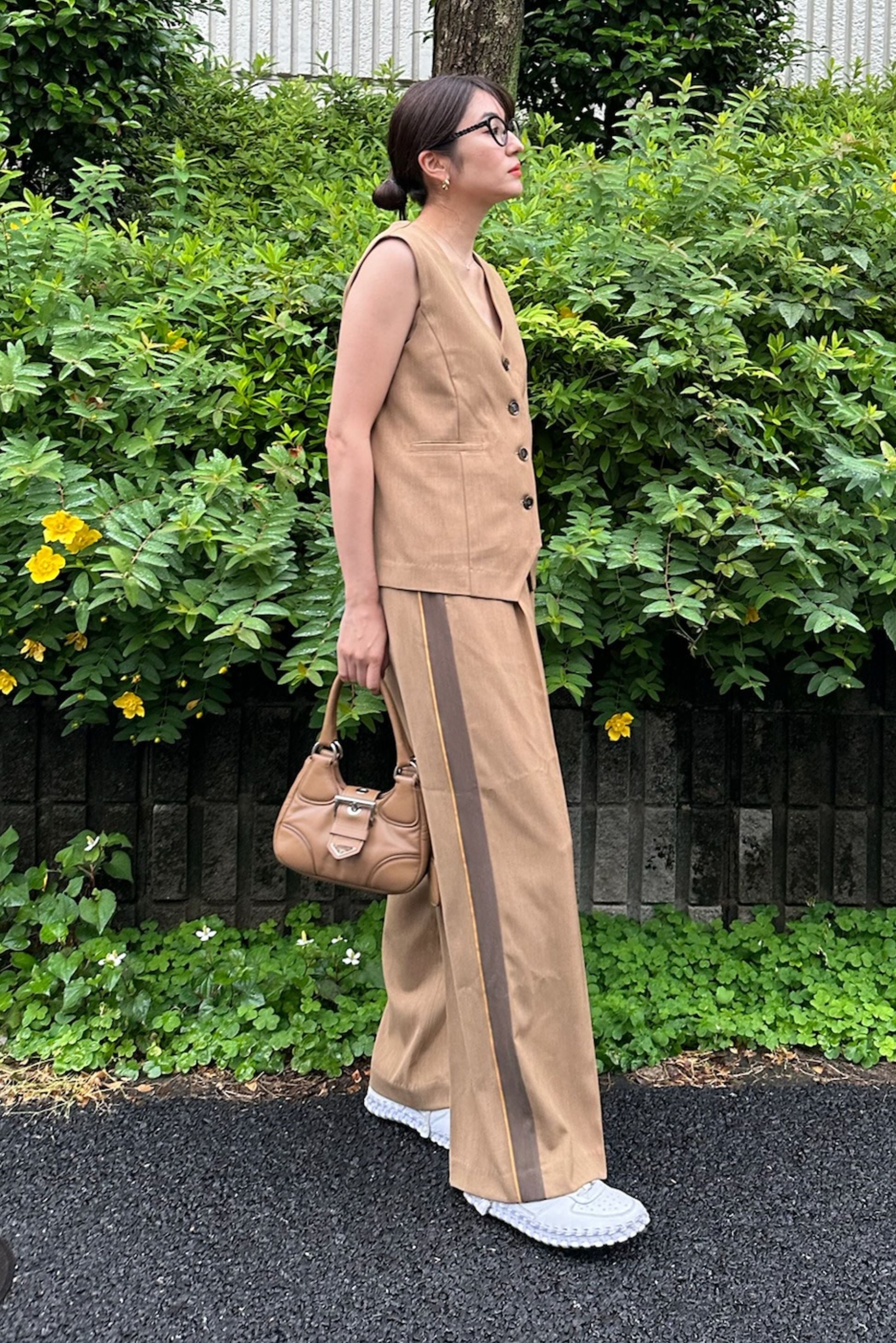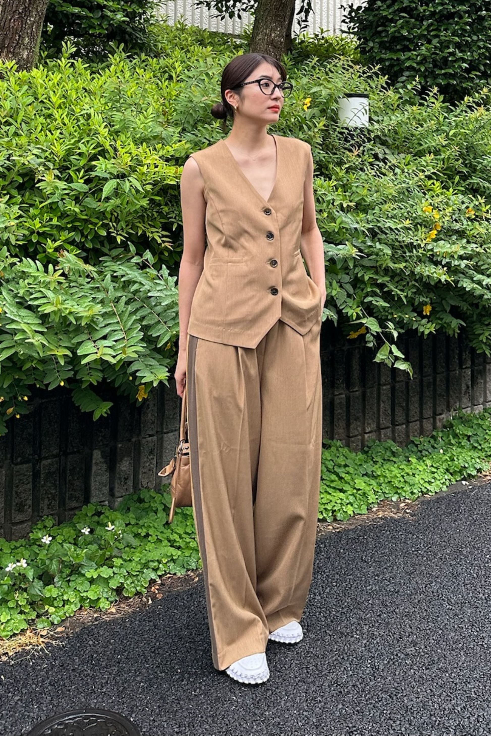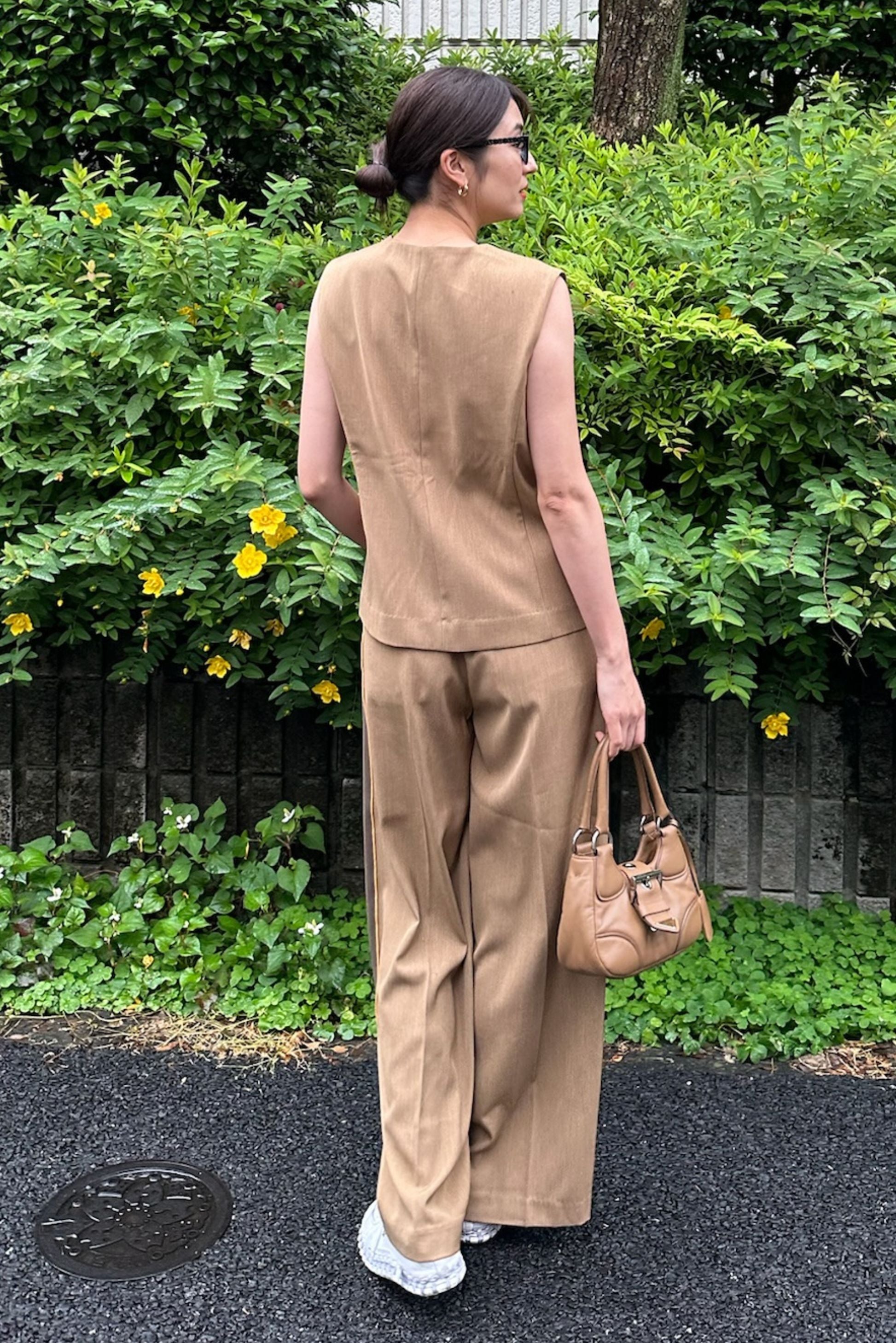 同素材のベストと合わせて、旬のセットアップスタイルが即完成。